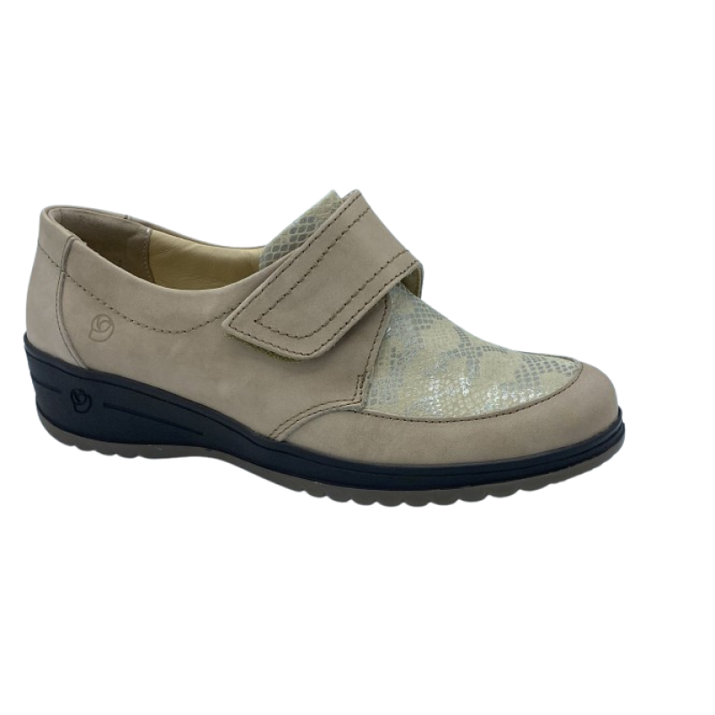 Zapato urbano con empeine liso y velcro ancho para una mejor sujeción. En piel natural negro combinado con reptil negro. Plantilla extraíble, anatómica, en piel y lavable. Piso Lyon de 3,5 cms de altura aprox.