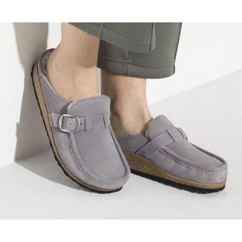 El modelo Buckley de BIRKENSTOCK es un zueco semiabierto en estilo de mocasín que se reconoce de inmediato como un modelo original de BIRKENSTOCK gracias a la ancha suela de corcho. La llamativa costura se convierte en el centro de atención. Este modelo clásico se presenta aquí en una versión muy agradable con lana de borrego y nuestra popular hebilla Big Buckle. ¡El calzado perfecto para una acogedora noche de invierno frente a la chimenea! El material superior, de ante especialmente suave, aporta naturalidad al diseño y se adapta al pie como una segunda piel.