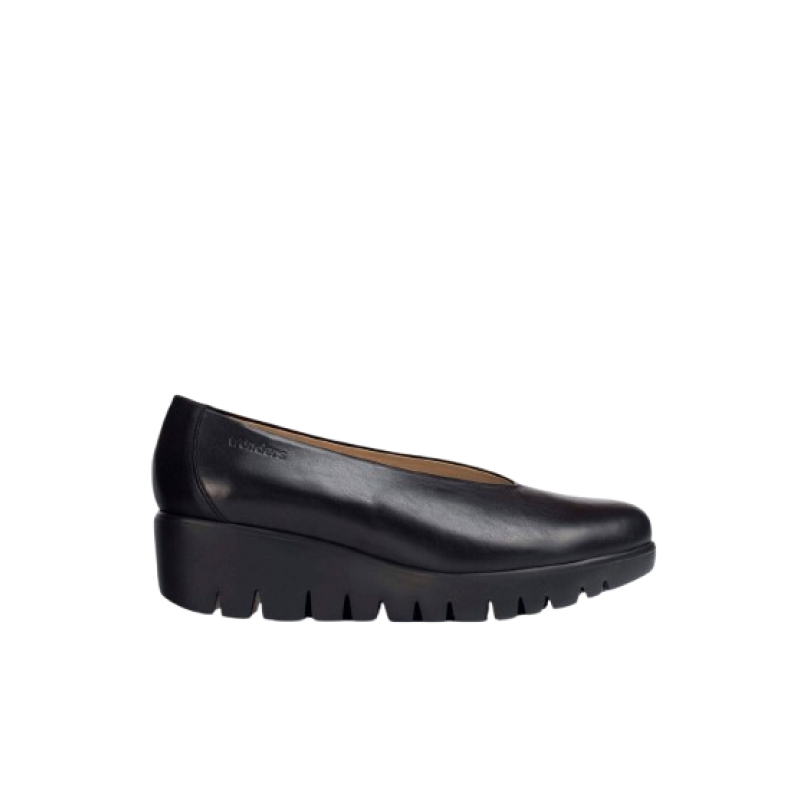 Zapatos con cuña FLY, confeccionados en piel lisa. Este modelo clásico y atemporal presenta un escote alto y punta redonda, siendo uno de los icónicos de Wonders. La suela desarrollada con tecnología WondersFly™ asegura ligereza incomparable, mientras que la plantilla interior de MemoryGel garantiza comodidad en cada paso.